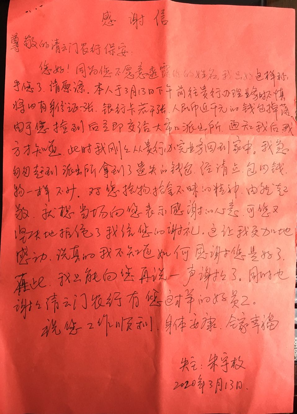 3月13日,朱宇枚先生高高兴兴地从派出所认领了自己丢失的钱包后,来到农业银行镇江分行青云门网点对保安员汤娟表达了深深的谢意,并送感谢信表示感谢。