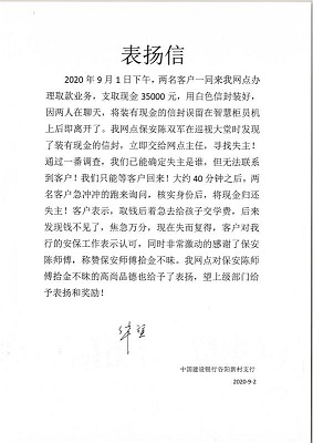 银行方对保安员陈双军拾金不昧的高尚品德给予了充分肯定,专门给公司发来了表扬信。