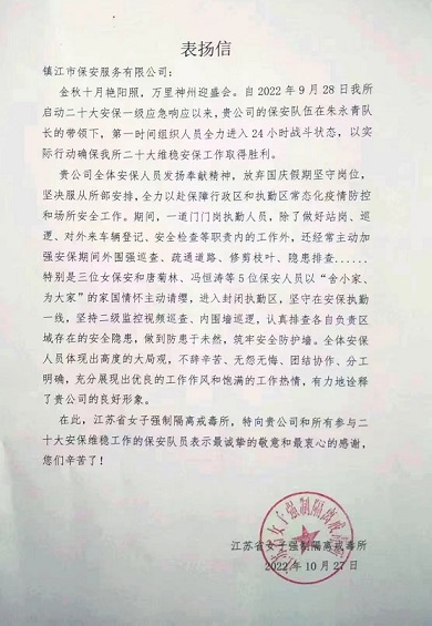 2022年10月27日,公司收到江苏省女子强制隔离戒毒所发来的《表扬信》,对在党的二十大期间维稳安保工作中爱岗敬业、认真履职的保安队员给予表扬。