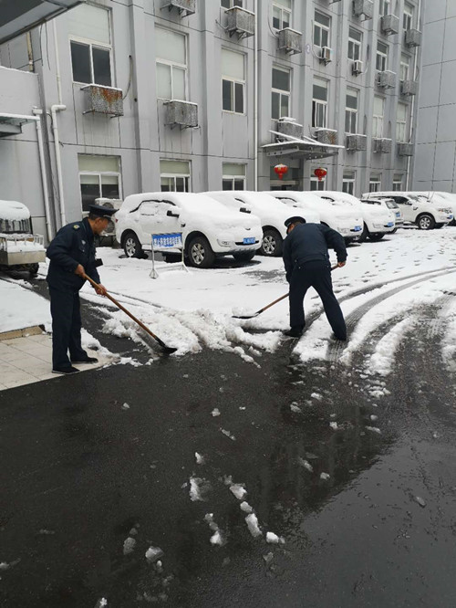 为畅通道路交通,保障安全,公司守押队员及保安队员在部门的统一部署下,主动提前来到各自的岗位开展扫雪工作。押运分公司的队员们天刚蒙蒙亮就做好出车前的准备,一大早利用扫把、簸箕等工具对押运车辆、院子及公司门前道路进行除雪和检查。各驻点队员们在寒风中加班加点,清理各聘用单位内部及周边主、次干道上的积雪。