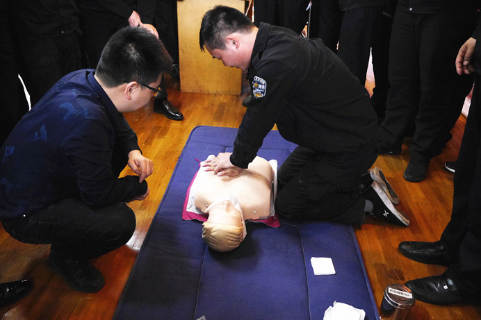 课上,潘科长为大家讲解了心肺复苏、排除气道异物等基本技能,讲述了亲身经历的抢救实例,着重讲解了心肺复苏适用病例以及实施方法,大家积极参与互动,热情高涨,边听边记,表现出了极大的兴趣。潘科长对大家学习的热情和认真态度给予了充分肯定。最后在潘科长的指导下,每位同志进行了模拟人心脏复苏操作。