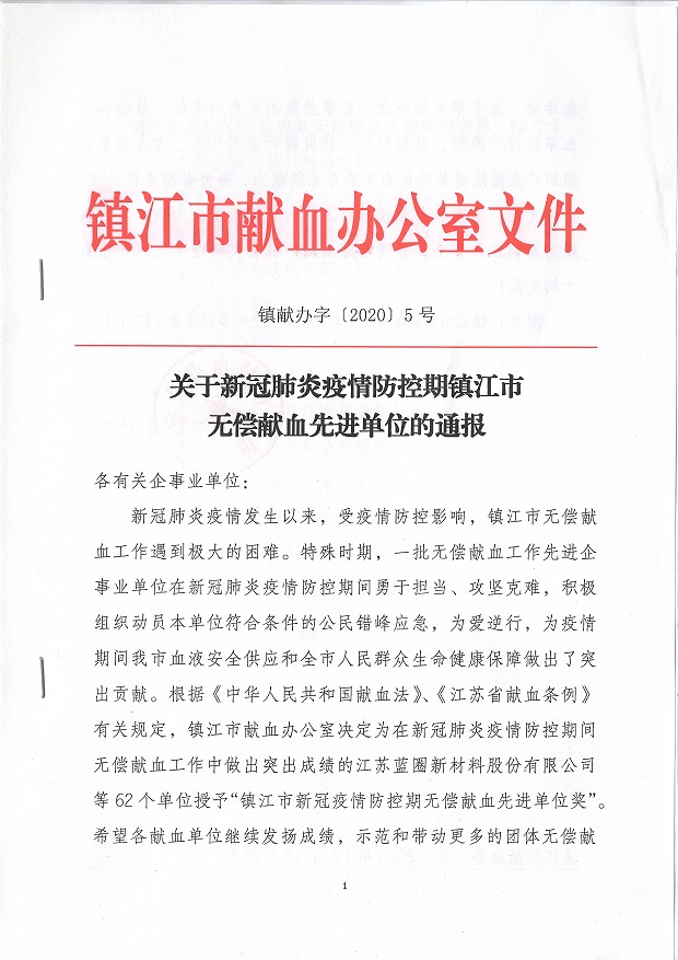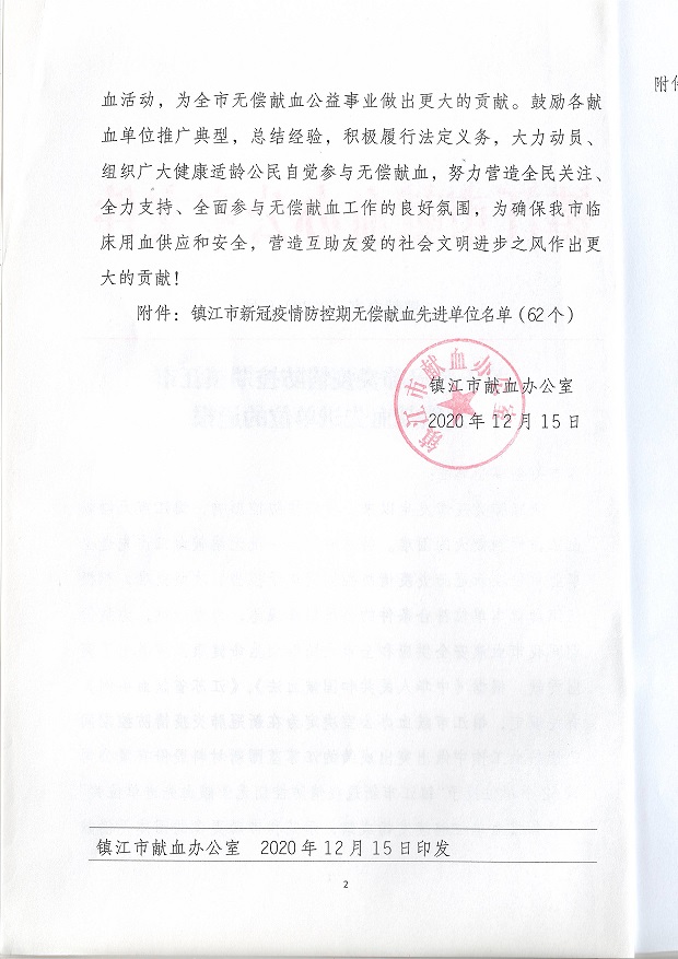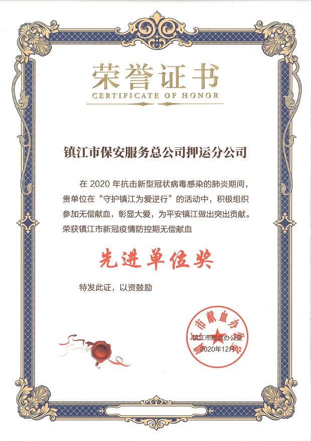 近日,喜讯传来,镇江市献血办公室授予我公司押运分公司新冠疫情防控期无偿献血先进单位奖。