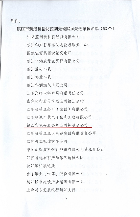 我公司押运分公司荣获镇江市新冠疫情防控期无偿献血先进单位奖