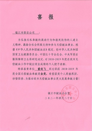 近日,镇江市保安服务有限公司保安队员董剑飞同志荣获了由国家卫生健康委员会、中国红十字总会、中央军委后勤保障部卫生局联合颁发的“2018-2019年度全国无偿献血奉献奖金奖”。该奖是对献血8000毫升以上的人士颁发的国家级贡献奖。