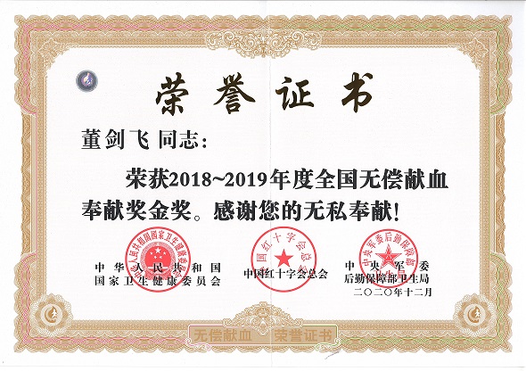 董剑飞同志自2006年起,坚持每年多次无偿献血和献血小板。荣誉的获得是对他捐献热血、无私奉献的充分肯定,也是他对造福社会、贡献社会、大爱无彊人生价值的体现。