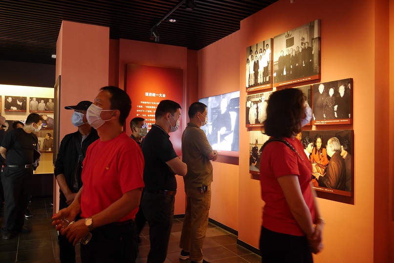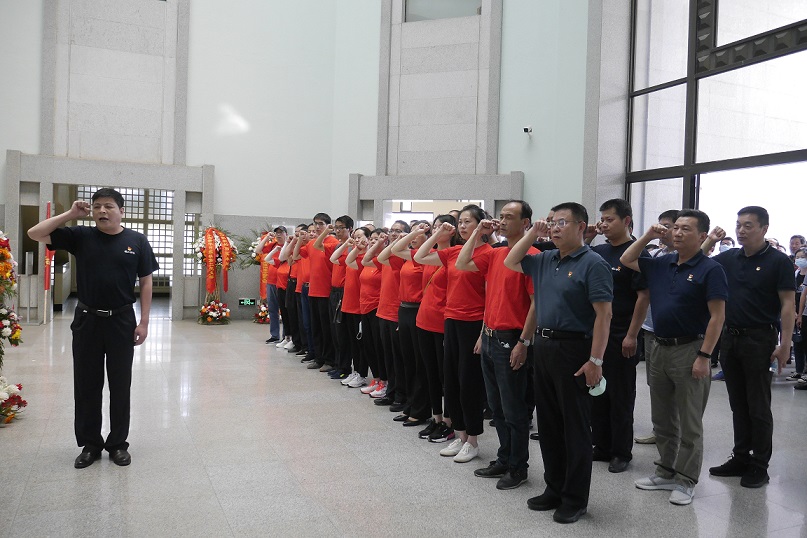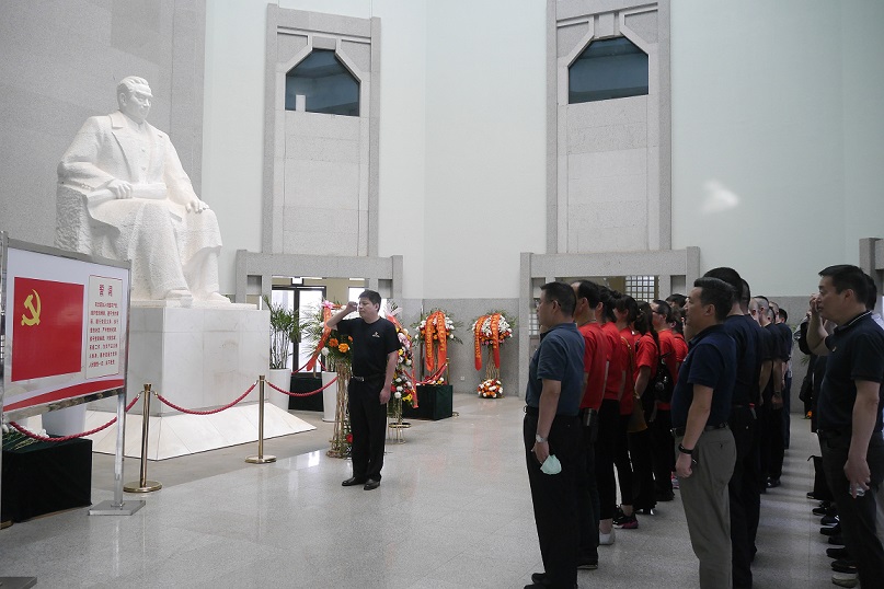 全体党员在周恩来纪念馆主馆,在鲜红的党旗下举手宣誓,重温入党誓词。