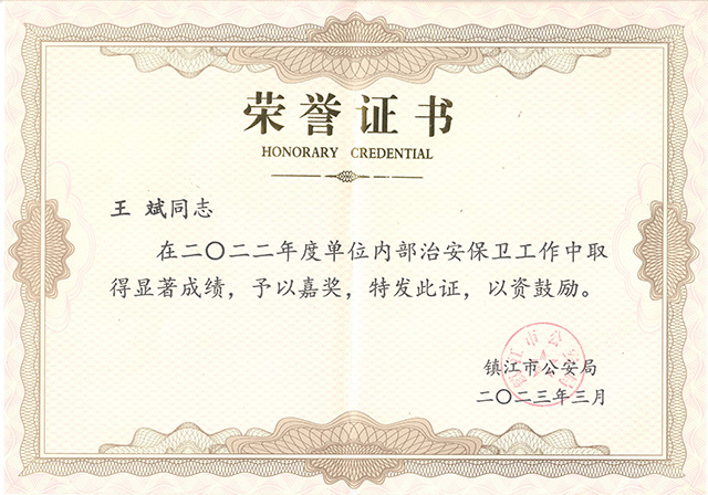 近日,镇江市公安局对2022年度全市单位内部治安保卫工作作出显著成绩的先进集体和个人进行表彰。我公司金融押运分公司荣获全市内部治安保卫工作集体三等功、服务分公司行政中心保安大队大队长王斌荣获全市内部治安保卫工作个人嘉奖。